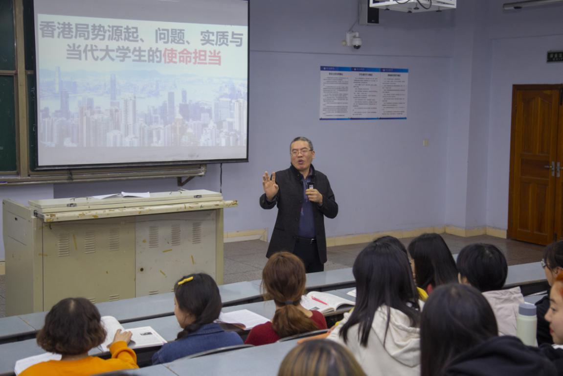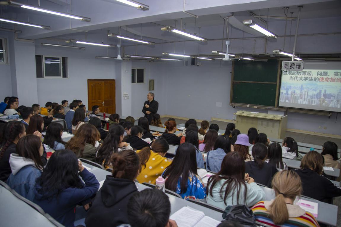 11月4日晚,学校副校长徐晓宗教授在博文楼412教室为文学与传播学院学子讲授题为“香港局势的源起、问题、实质”的形势与政策课。taptap点点足彩院长刘长江、文学与传播学院辅导员、2018级部分学生到场聆听。