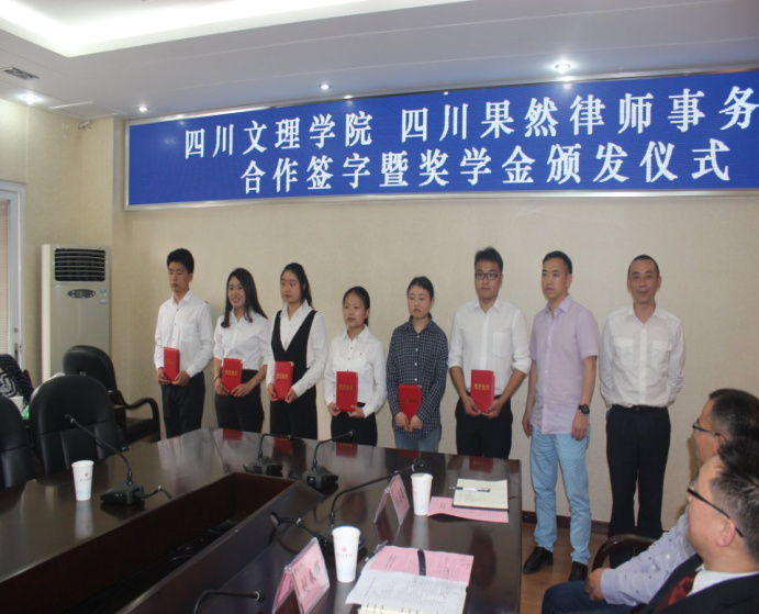 接下来,邓杰处长和田金陇主任分别代表双方签署校企合作协议。王成端书记代表学校向四川果然律师事务所授“四川文理学院教育教学实践基地”牌匾。然后,邓杰处长宣读了2017-2018学年“果然奖学金”获奖名单,李魏、王顺平、何秀霞、王潇、任静欢、王川江等6名同学分别获得一二三等奖学金。朱世健和周健主任代表果然律师事务所向获奖学生颁奖。之后,李魏代表获奖学生发言,他首先对学校和四川果然律师事务所的培养与关心表示由衷感谢,他介绍了自己在文理学院的成长经历以及在律师事务所见习的收获,并誓言将荣誉化作动力,今后更加努力地学习和工作。