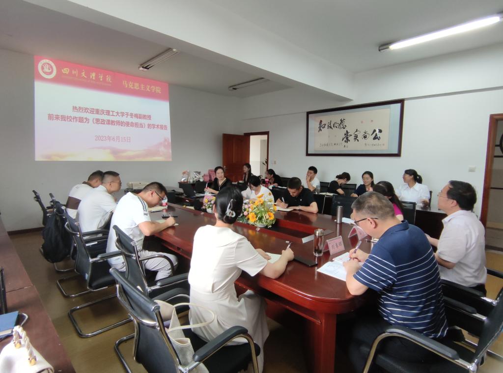 6月15日,重庆理工大学于冬梅副教授应邀在我校博文楼611会议室作题为《思政课教师的使命担当》的学术报告。taptap点点足彩院长孙杰主持,taptap点点足彩党委书记刘春辉及全院教师参会。