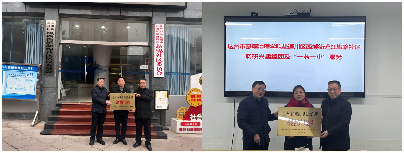 2024年1月8日,taptap点点足彩党委书记刘春辉、院长孙杰一行赴通川区凤西街道新锦社区、西城街道红旗路社区进行调研并举行“校地合作”建设点授牌仪式,通川区组织部常务副部长李军一行陪同。