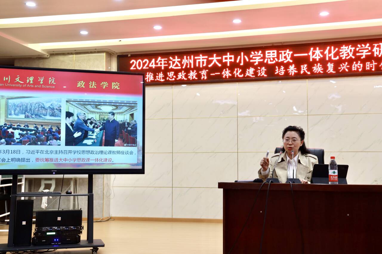 在听取达州市小学、初中及高中学段教师观摩课之后,政法学院曹红梅教授以《“一体化”视域下大中小思政课教学目标和方法漫谈》为题开展了针对性专题讲座,曹教授从“大中小学思政一体化”的相关问题、教学反思、教学目标和教学方法几个方面进行阐释,她指出,要打造大中小学思政课一体化教学共同体,小学阶段要注重培养学生的道德情感,初中、高中阶段着力培养学生的思想基础、政治素养,大学阶段更要关注学生的责任担当。