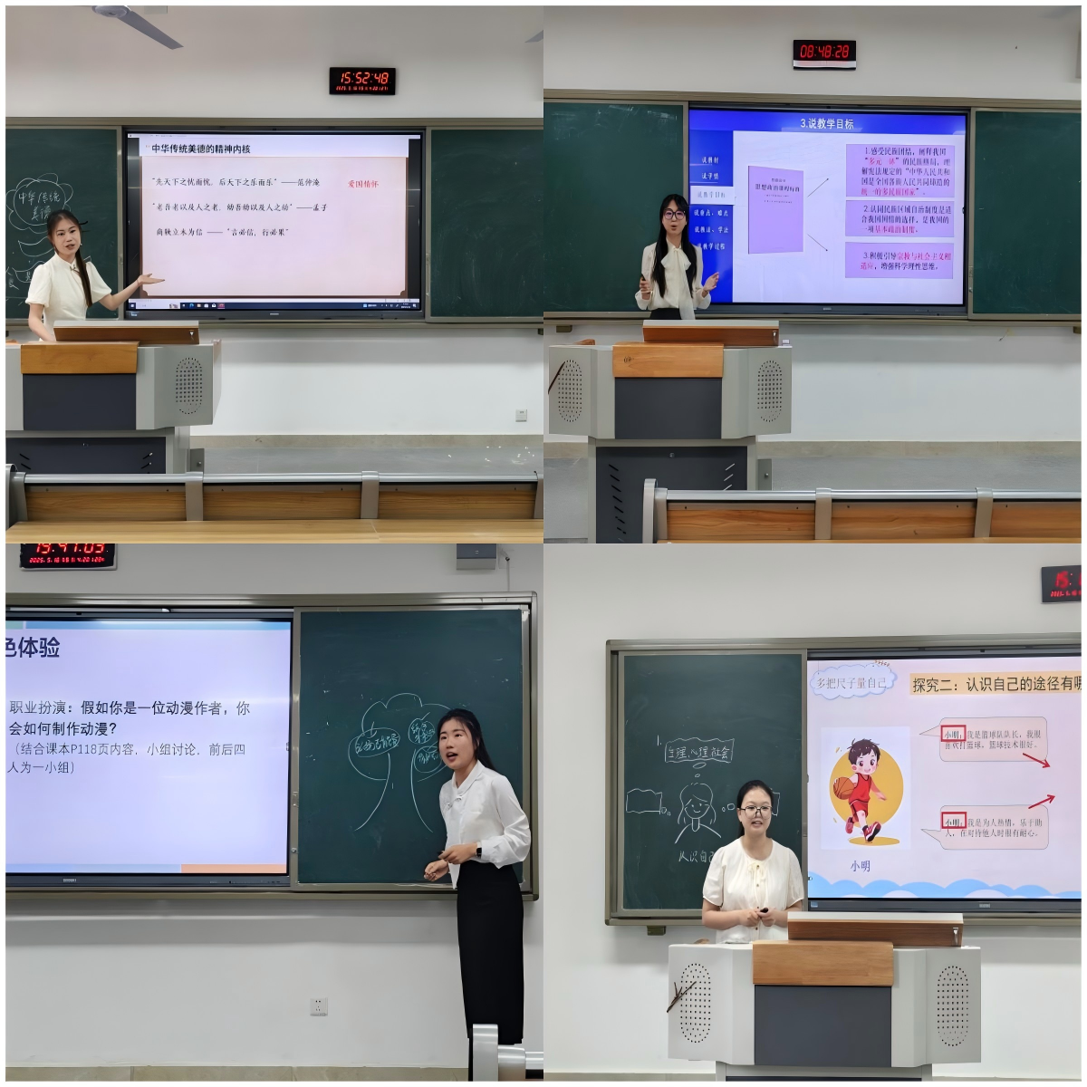 比赛过程中,各参赛选手根据教学设计方案,围绕所选教学主题进行限时3分钟的说课和10分钟的模拟课堂教学展示。选手们在教学演示中教态自然大方,教学行为规范严谨。他们准确把握中学政治课程标准要求,科学设计教学目标,教学环节层层递进、脉络清晰,板书设计巧妙呈现知识体系,展示了taptap师范生扎实的专业功底。