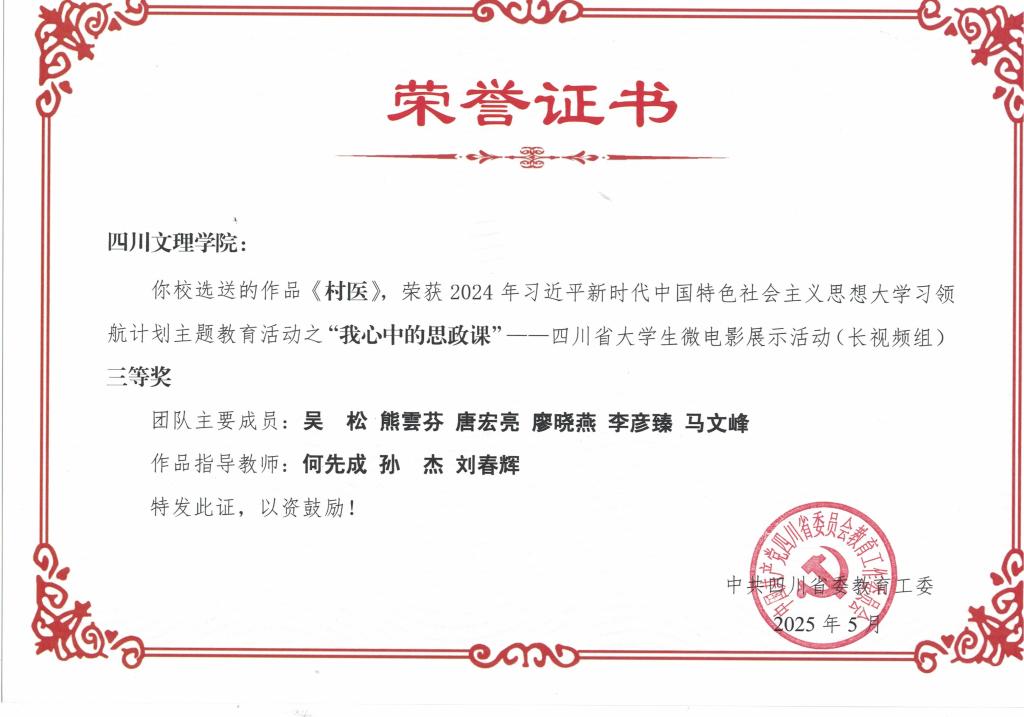 在“我心中的思政课”四川省大学生微电影展示活动(长视频组) 中,taptap选送的作品《村医》获三等奖。《村医》由吴松、熊雲芬、唐宏亮、廖晓燕、李彦臻、马文峰等同学组成创作团队,在何先成、孙杰、刘春辉三位教师的悉心指导下完成。影片聚焦基层医疗工作者扎根乡村、守护健康的感人事迹,以细腻的镜头语言和真实的故事呈现,生动诠释了基层工作者的使命与担当,将思政教育元素融入影像艺术之中。