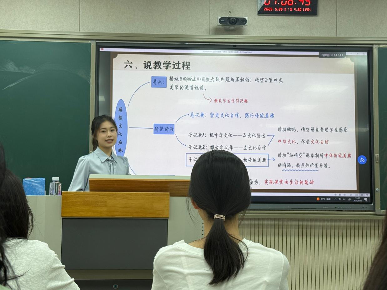 本次比赛在赛制设计上对标川渝师范生教学能力大赛的比赛流程和要求,包括说课、模拟授课、即席演讲和现场答辩四个环节。在说课环节,选手们通过教学目标、学生学情、教学重难点、教学方法和教学过程设计等阐述其设计背后的理念和依据;在模拟授课环节,选手们的教学环节衔接自然、层次清晰、师生互动组织恰当、板书设计整洁;在即席演讲环节,选手们展现出较高的教育教学素养、较强的逻辑思维能力、精准的语言表达能力和灵活的应变能力;现场答辩环节,选手们对评委提出的专业问题作了条理清晰地回答。